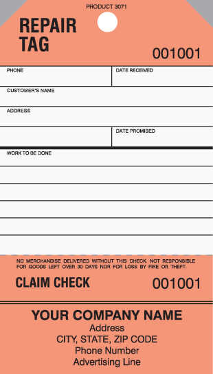 These Repair Tags are perfect for any repair shop to handle repairs and give the client a receipt.